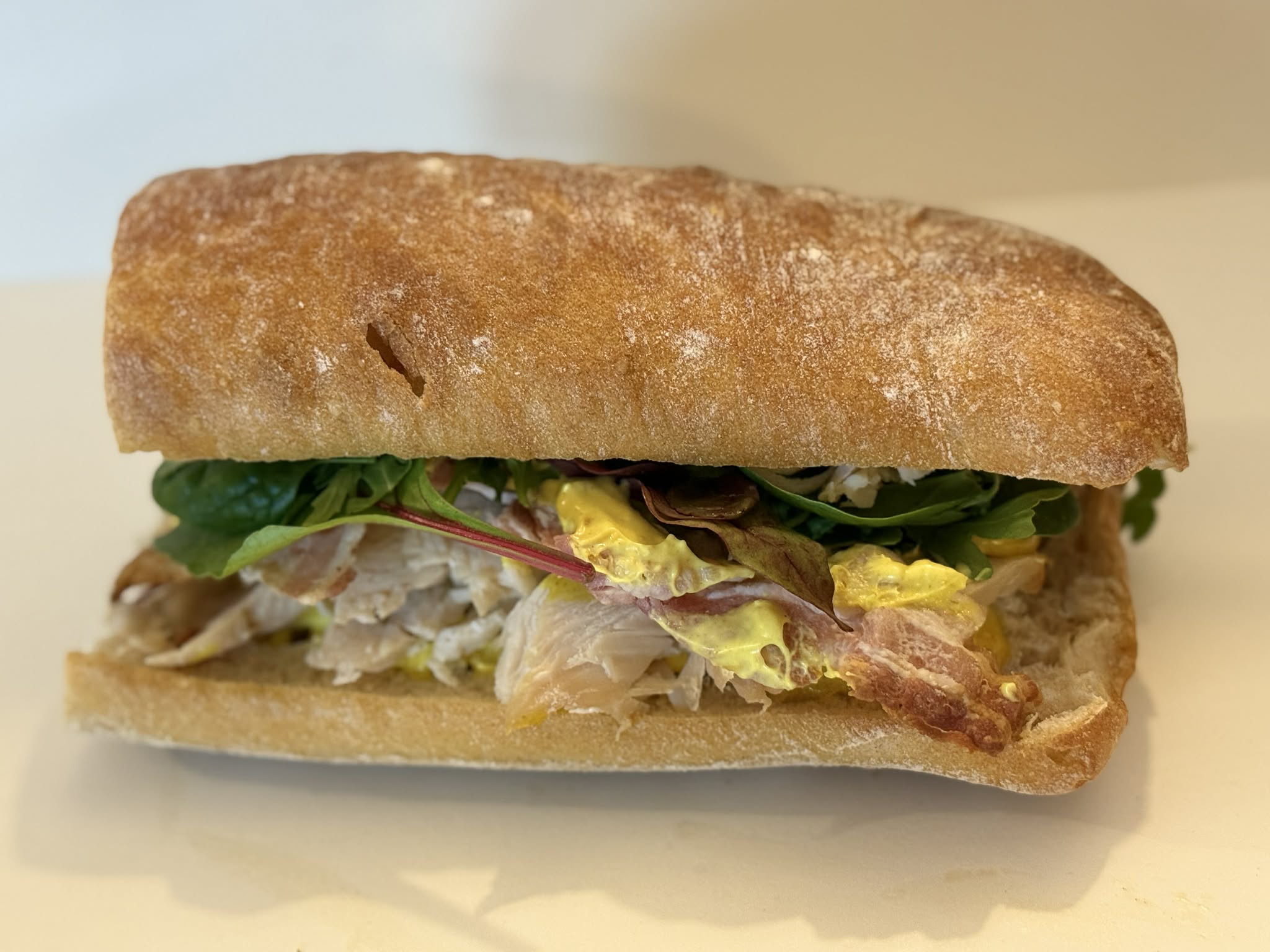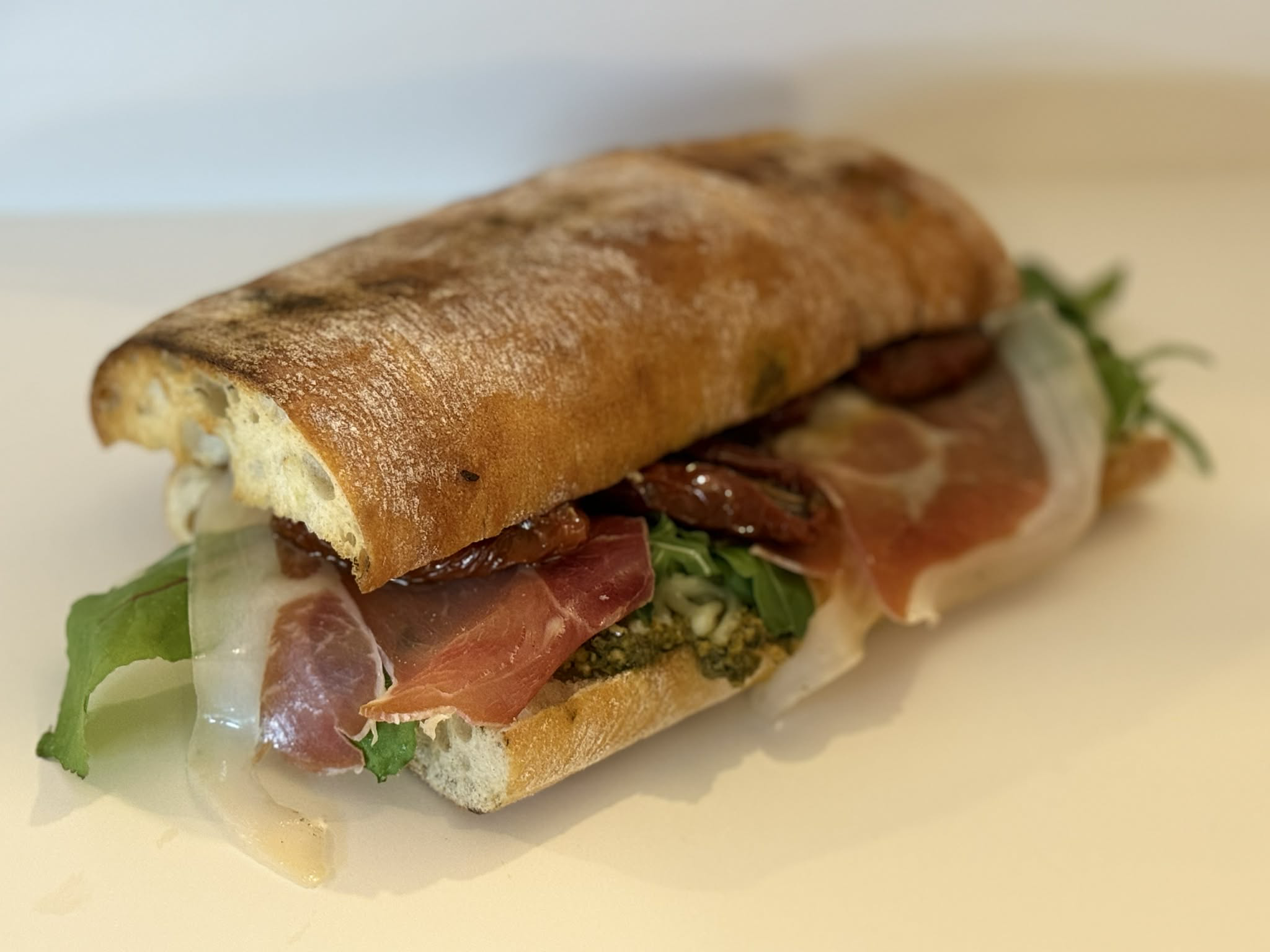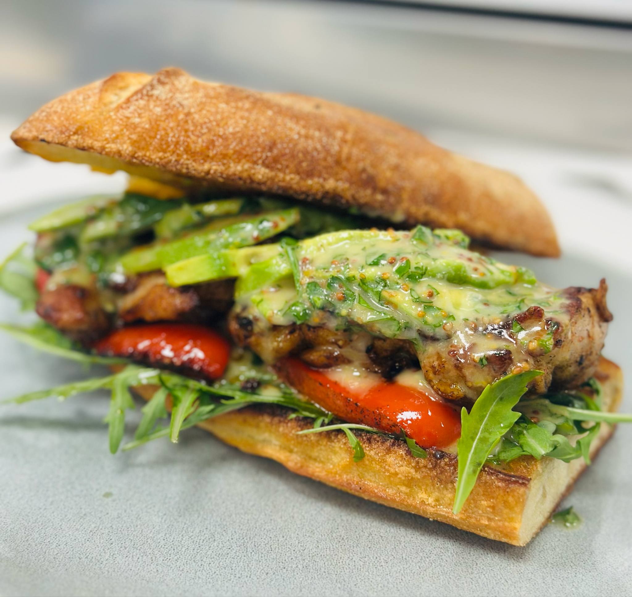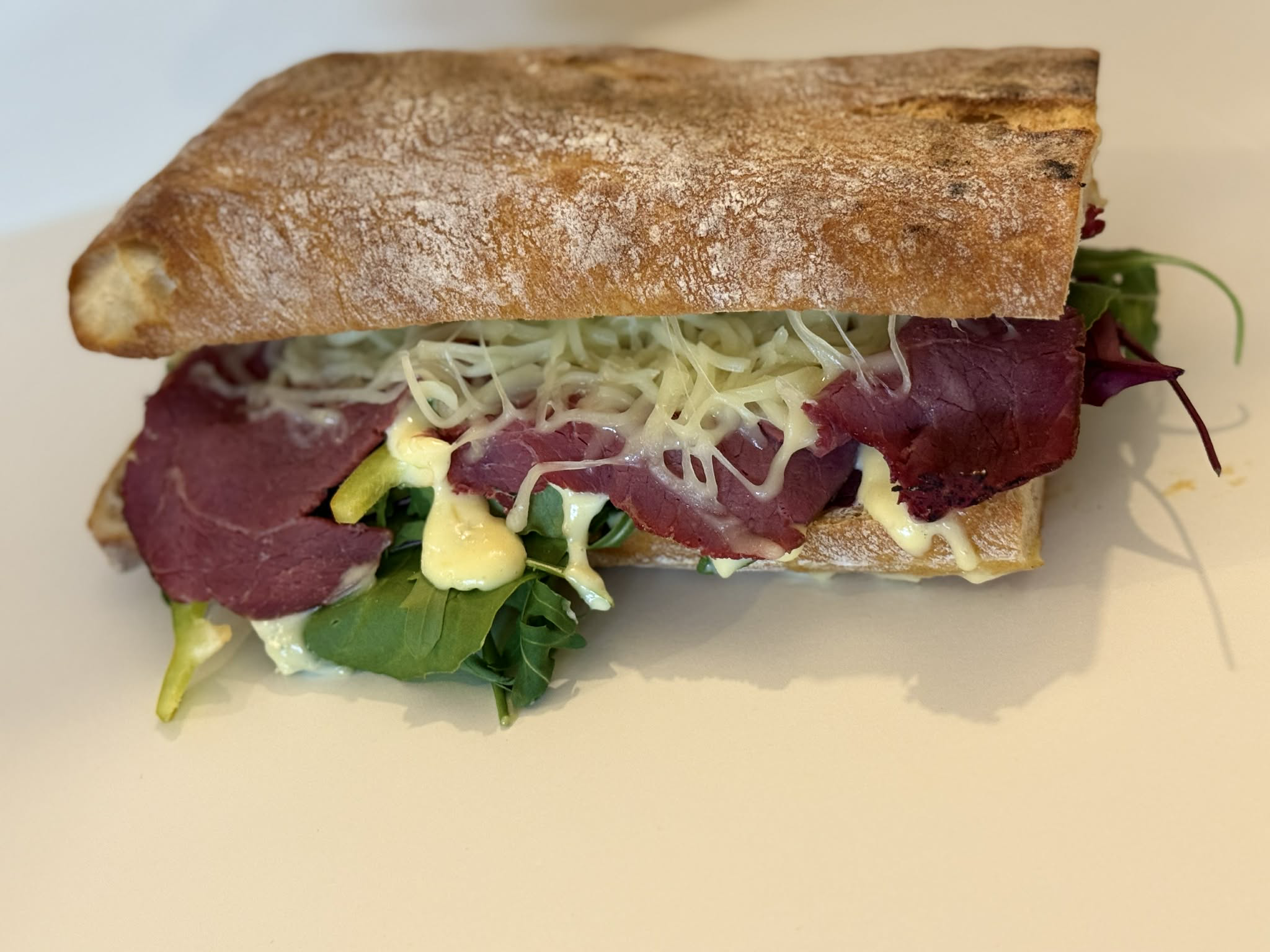 Avocado mayo, bleytan leyk, roastbeef, salat mix, jalapenos og mozzarella